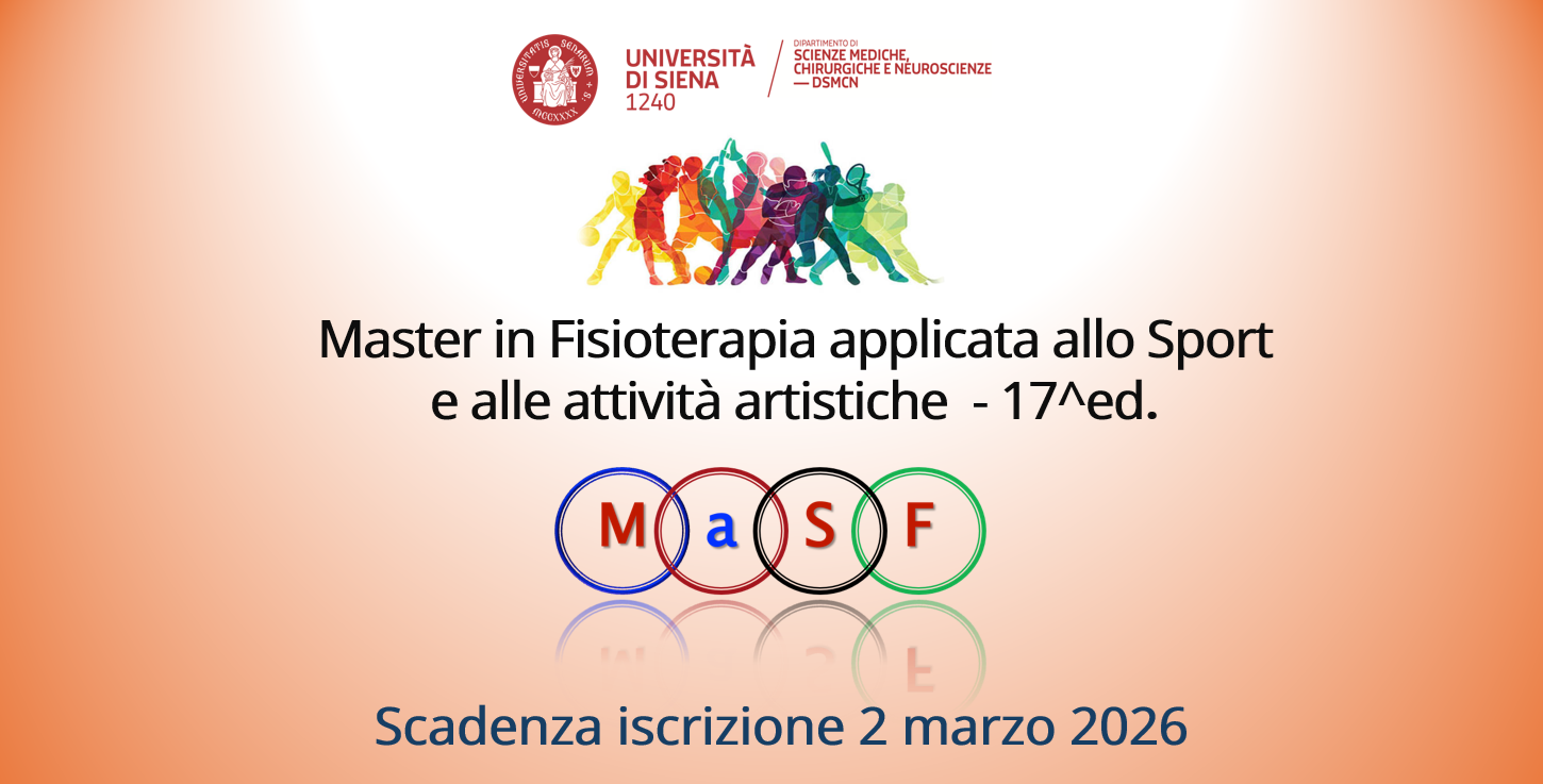 Sono aperte le iscrizioni alla 17 ed. del Master Universitario in FISIOTERAPIA APPLICATA ALLO SPORT E ALLE ATTIVITA’ ARTISTICHE (Ma.S.F.), promosso e organizzato dall’Università di Siena, con scadenza 2 marzo 2026.