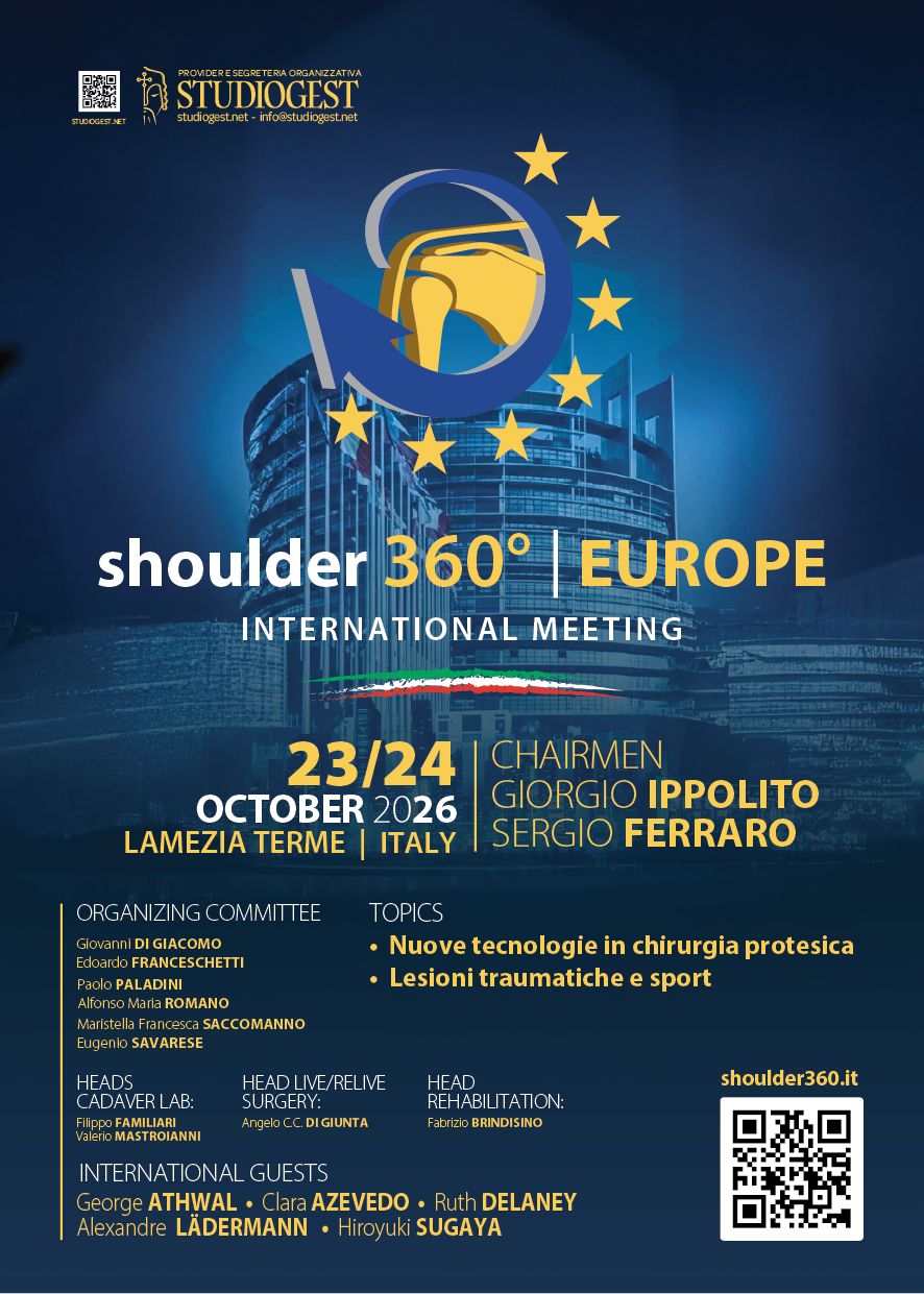Il congresso “Shoulder 360 Pro Europe” è giunto oramai alla sua quarta Edizione che si terrà nuovamente a Lamezia Terme nella splendida Calabria il 23 e 24 Ottobre 2026. Sarà presieduto anche quest’anno dal dr. Giorgio Ippolito e dal dr, Sergio Ferraro che hanno però allargato il Board Scientifico ad un gruppo di lavoro di altissimo profilo. Dopo lo straordinario successo del 2019 e del 2022 e del 2024, la quarta edizione si presenta ancor più piena di argomenti stimolanti, notevolmente arricchita da due ampie sessioni dedicate alla riabilitazione. Il congresso si svolgerà in due giorni con un programma scientifico di respiro internazionale per un evento senza precedenti per il sud Italia. I topics del meeting saranno: